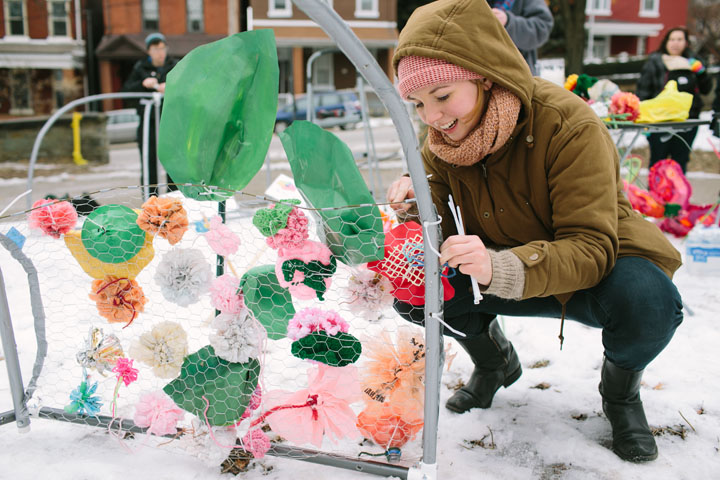 Bringing unexpected brightness and joy in the middle of winter through pop-up flower gardens made from repurposed, durable materials.